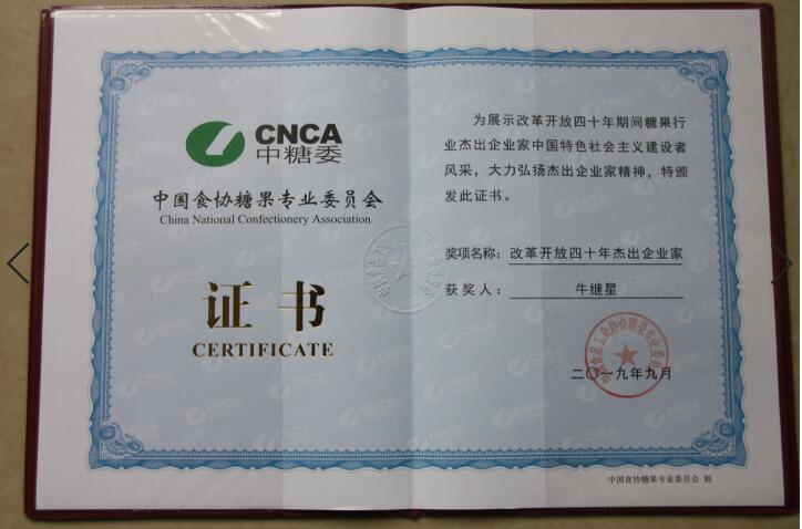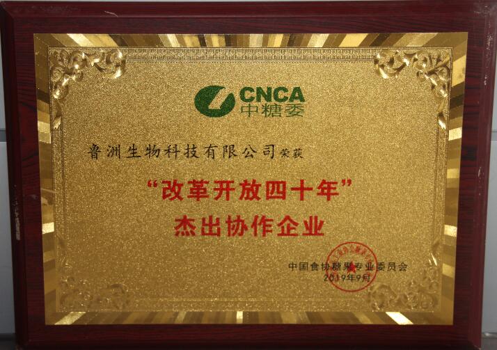 魯洲生物科技有限公司榮獲中國食協糖果專業委員會 “改革開放四十年”杰出協作企業,董事長牛繼星榮獲“改革開放四十年”杰出企業家。